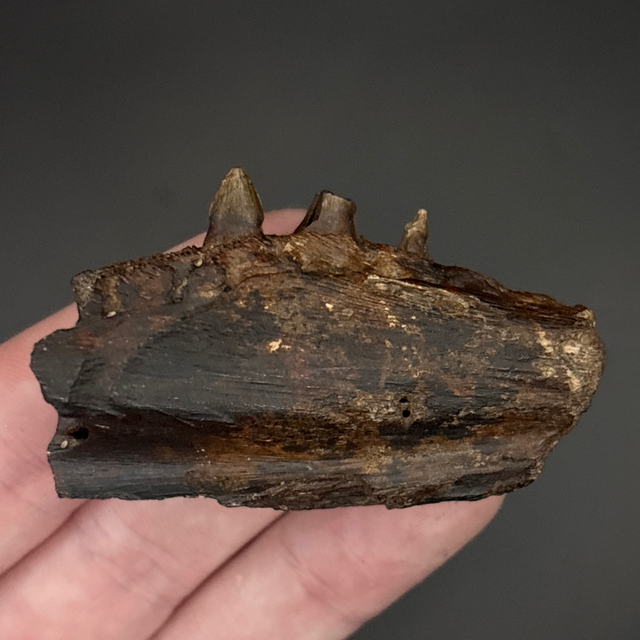Alligator jaw section found in the Suwannee River in Florida, USA. This fossil is around 8 million years old (Miocene). The fossil measures 5.9cm in length, 1.9cm in width and 3.5cm in height. Has had no repairs and no restoration.
