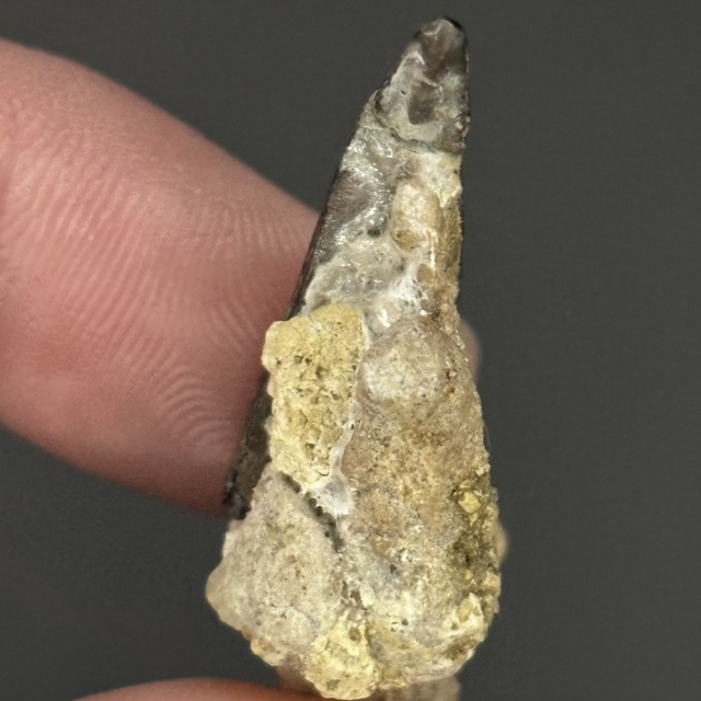 A rare partial Baryonyx tooth found in Brook Bay on the Isle of Wight, UK. This fossil is around 130 million years old (Cretaceous). The tooth measures 9mm in length 7mm in width and 2.5cm in height. Has had one repair to the tip and no restoration.