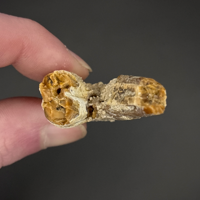Basilosaurus teeth found in Morocco. This fossil is between 40-34million years old (Cretaceous). The fossil measures 4.8cm in length, 2.9cm in width and 1.5cm in height. Has had one repair and no restoration.
