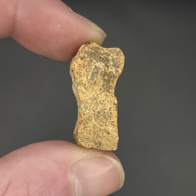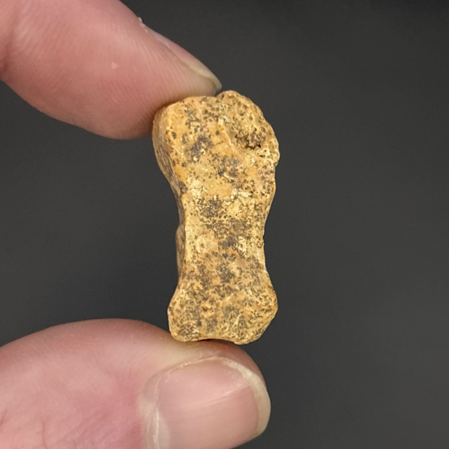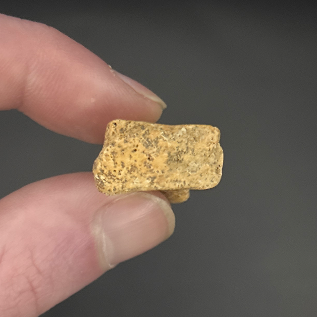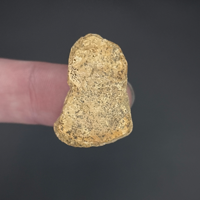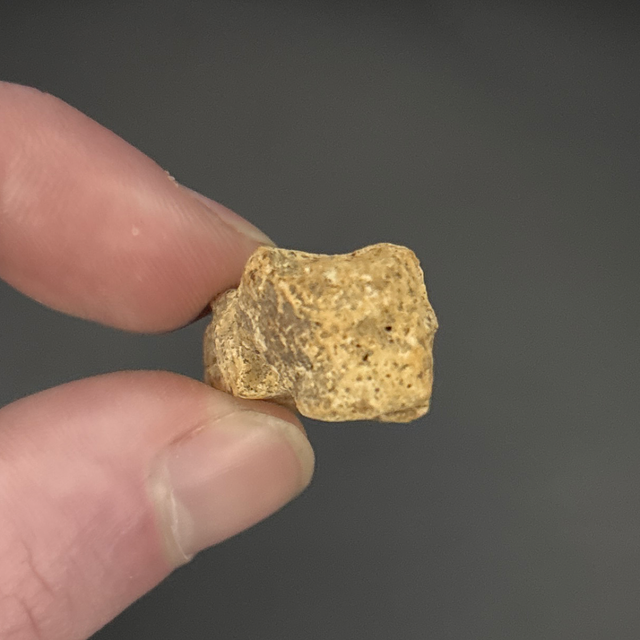 Cave Bear bone fragment found in Transylvania, Romania. This fossil is around 20,000 years old (Pleistocene). The fossil measures 2.5cm in length, 1.9cm in width and 1.3cm in height. Has had no repairs and no restoration.