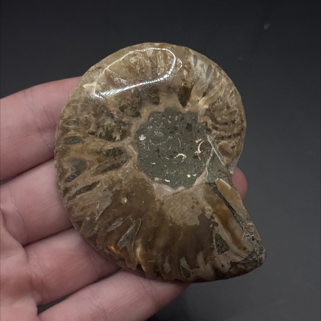 Cleoniceras ammonite (cut & polished) found in Madagascar. Between 113-100 million years old (Cretaceous). The fossil measures 6.5cm in diameter. Had had no repairs or restoration.