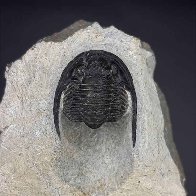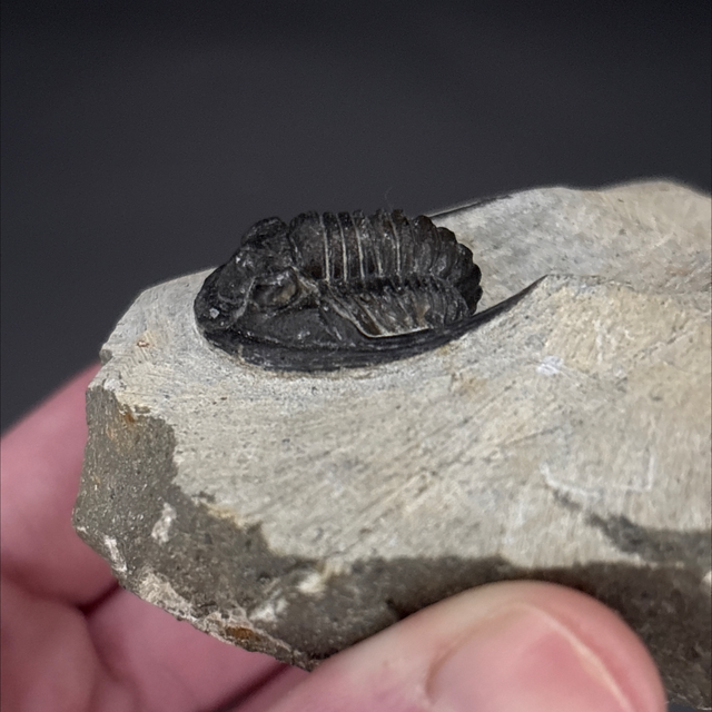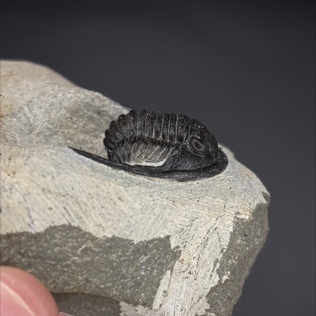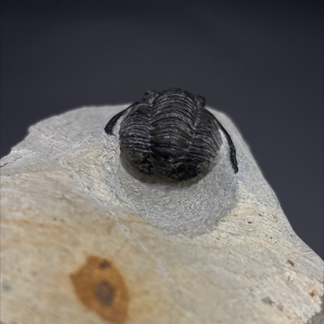 Cornuproetus trilobite found in the Anti-Atlas Mountains in Morocco. Around 380 million years old (Devonian). The trilobite measures 2.5cm in length, 2.5cm in width and 1cm in height. Has had one repair and no restoration.