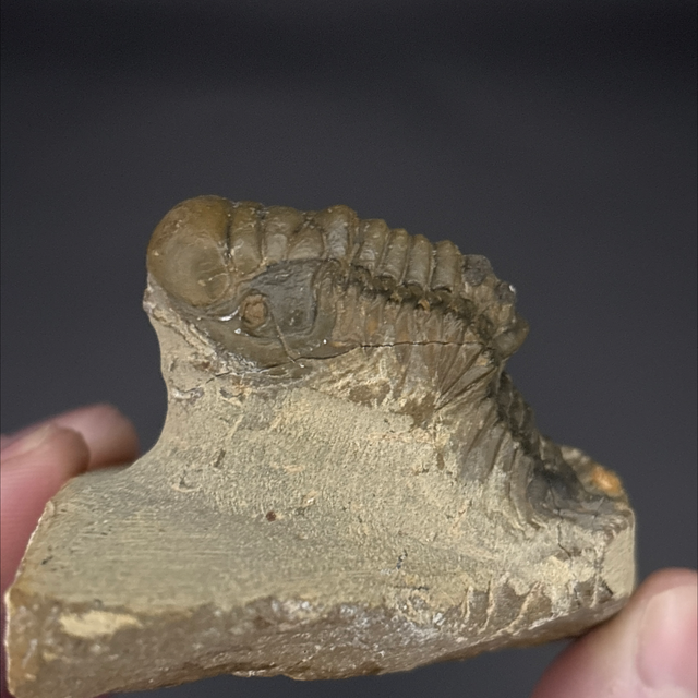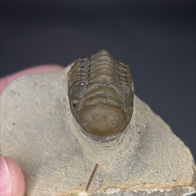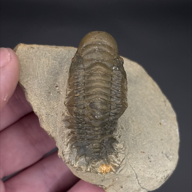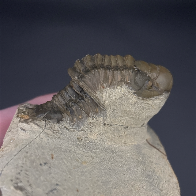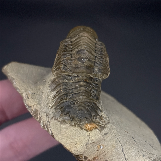 Crotalocephalina trilobite fossil found in Hamar Laghdad, Morocco. This fossil is between 419-358 million years old (Devonian). The trilobite measures 4.6cm in length 1.9cm in length and 2.4cm in height. Has had some repairs and a small amount of restoration.