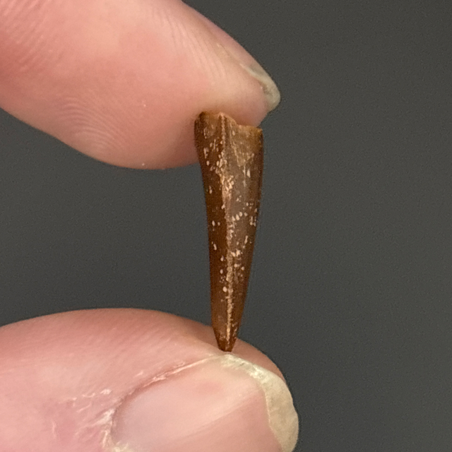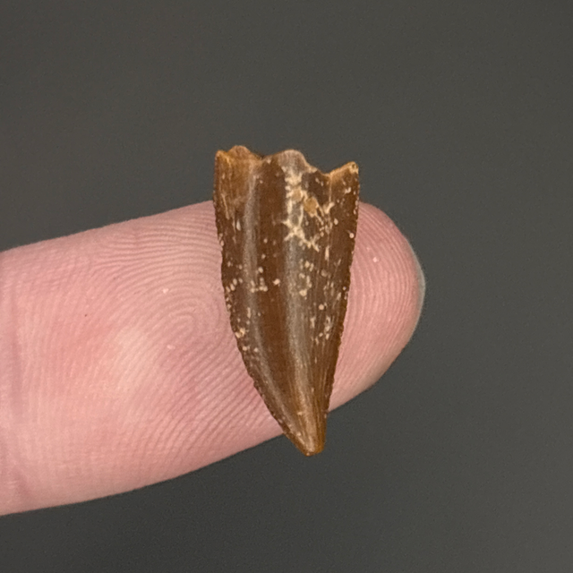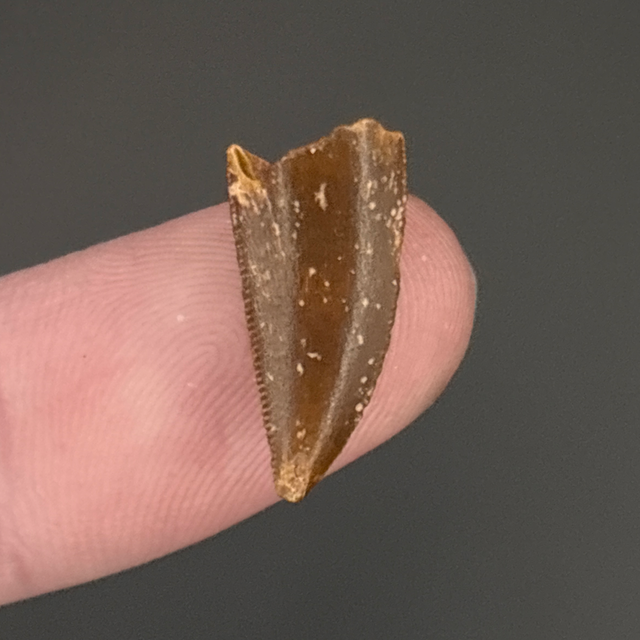 Deltadromeus tooth found in Morocco and is around 95 million years old (Cretaceous). The tooth measures 1.6cm in length 7mm in width and 4mm in height. Has had no repairs or restoration.
