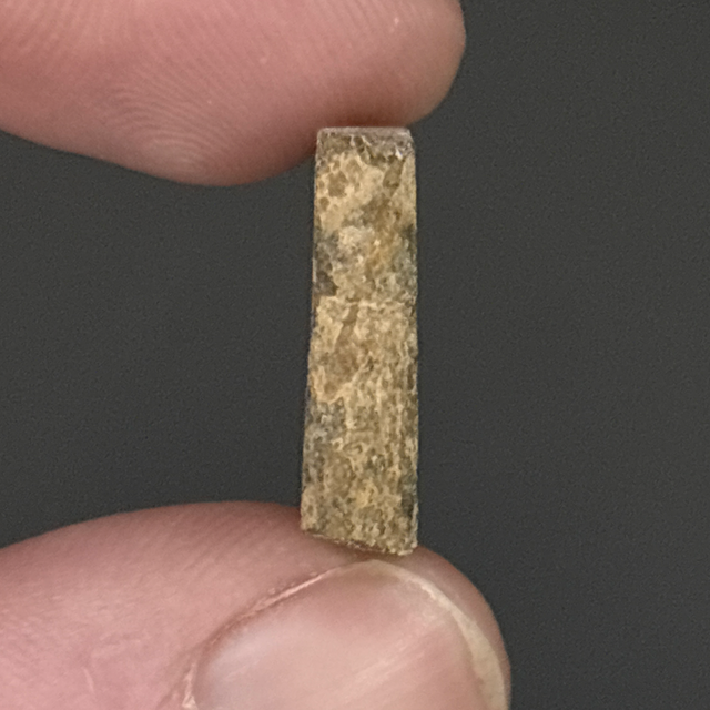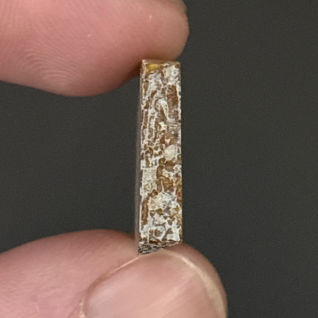 Dunkleosteus skull fragment slice found from the Famennian Strata in Morocco. Around 358 million years old (Devonian). The fossil measures 1.5cm in length, 1.6cm in width and 4mm in height. Has had no repairs or restoration.
