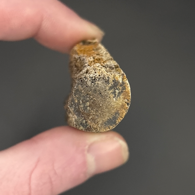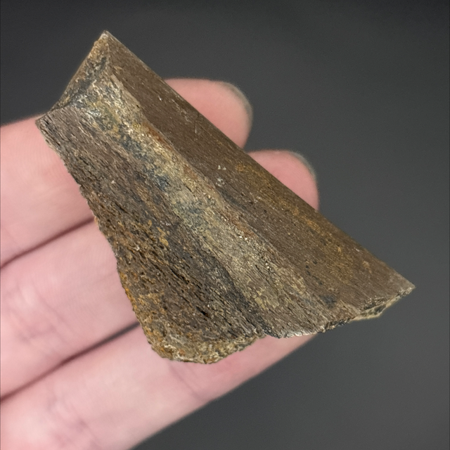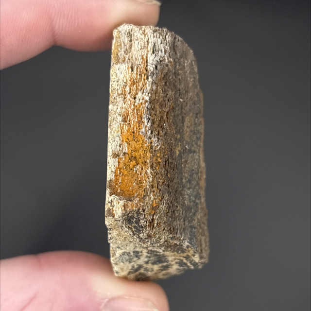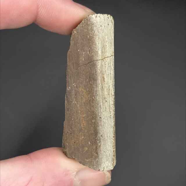 A dinosaur bone fragment from the duck billed hadrosaur Edmontosaurus. Found in South Dakota, USA and is between 68-66 million years old (Cretaceous). The bone measures 5.5cm in length 3.1cm in width and 1.9cm in height. Has had no repairs or restoration.