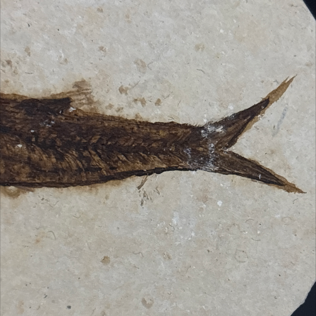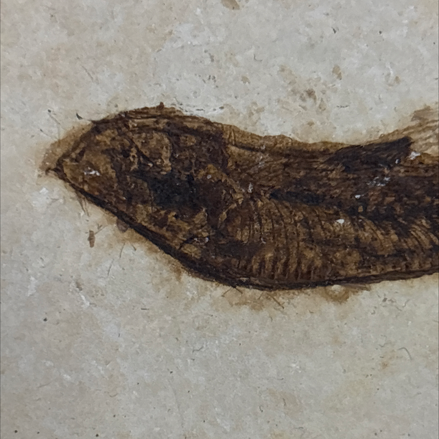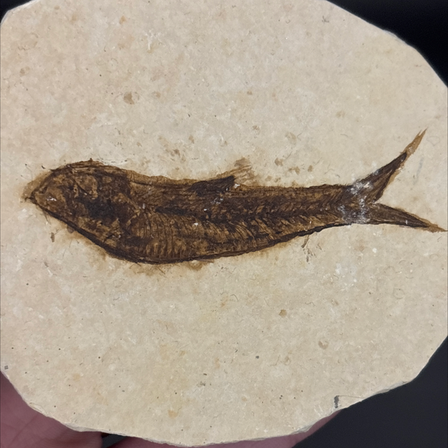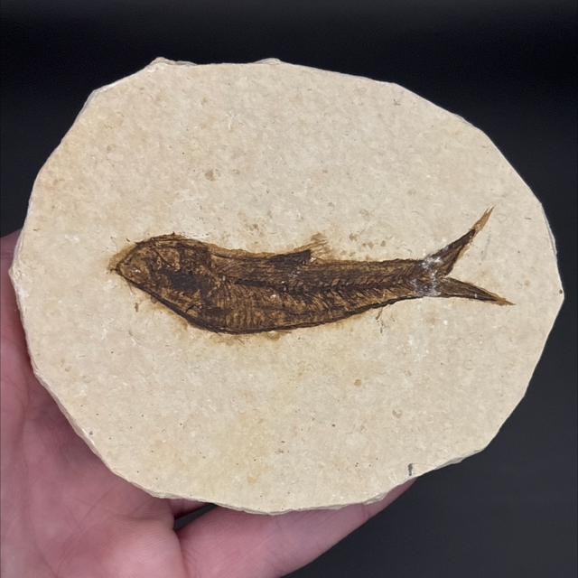 Knightia fish found in the Green river formation in Wyoming, USA. Around 55 million years old (Eocene). The fish measures 6cm in length and 1.5cm in width. Has had no repairs and no restoration. (Has been painted to highlight the fish but all the bones but all the bones are genuine).