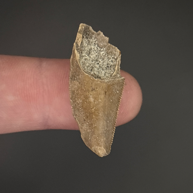 Majungasaurus tooth found in Madagascar. This fossil is between 70-66 million years old (Cretaceous). The tooth measures 3cm in length 1.4cm in width and 7mm in height. Has had no repairs or restoration.