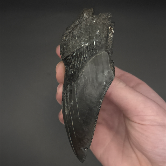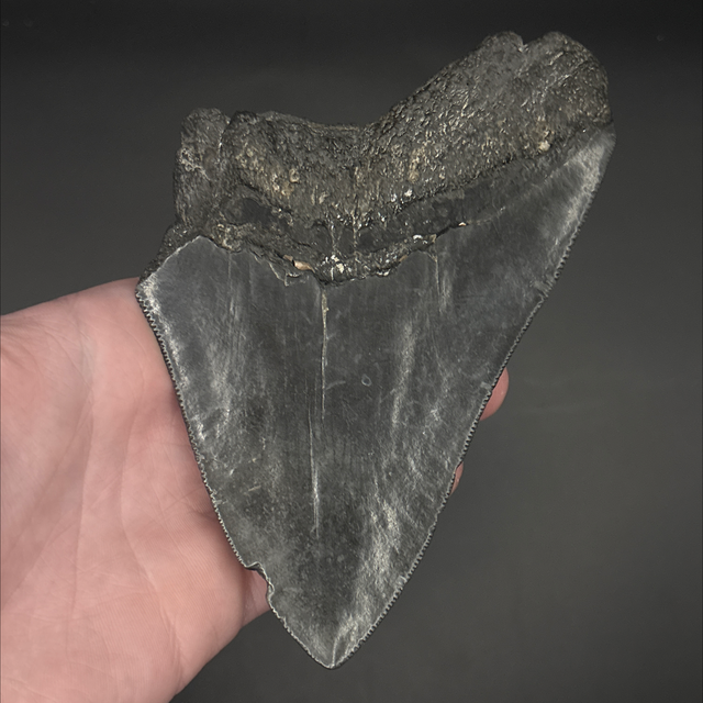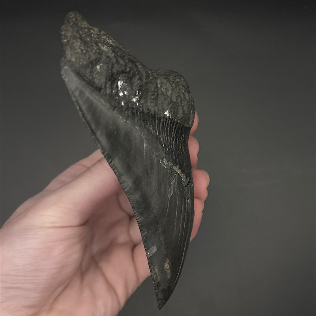 Megalodon tooth found in Florida, USA this fossil is between 12-9 million years old (Miocene). The tooth measures 11.6cm in length, 9.2cm in width and 3.5cm in height. Has had no repairs and no restoration.