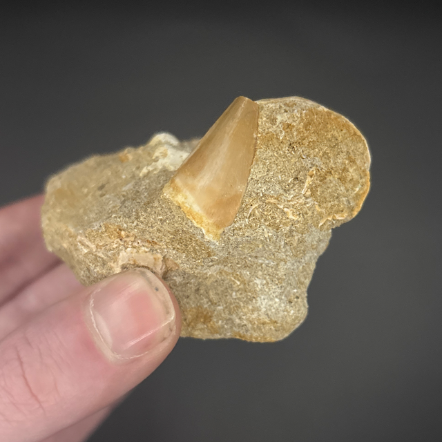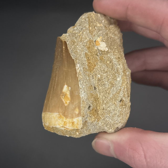 Two Mosasaur teeth found in Khouribga, Morocco. Around 70 million years old (Cretaceous). The larger tooth measures 4.5cm in length, 3cm in width and 2cm in height the smaller tooth measures 2.1cm in length, 1.5cm in width and 4mm in height. Has had no repairs and no restoration.