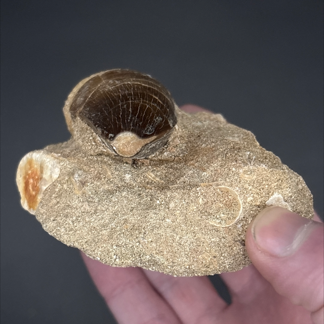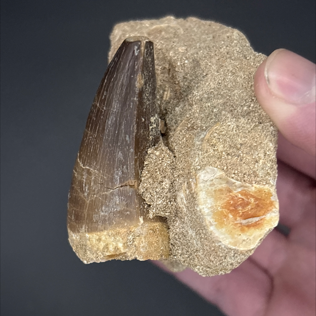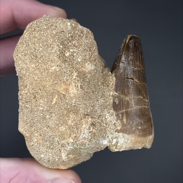 Mosasaur tooth found in Khouribga, Morocco. Around 70 million years old (Cretaceous). The tooth measures 5cm in length, 3cm in width and 2.5cm in height. Has had one repair and no restoration.