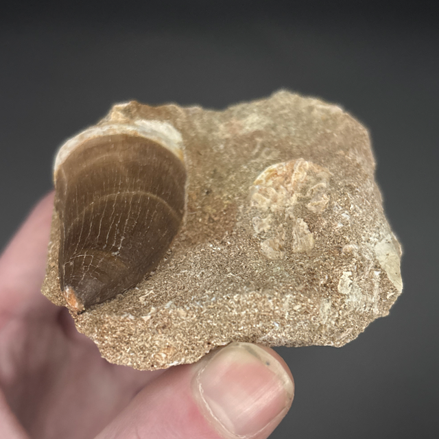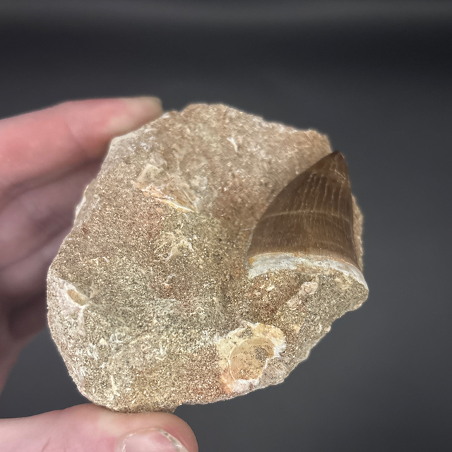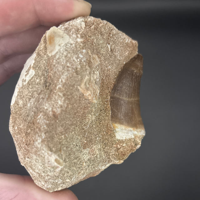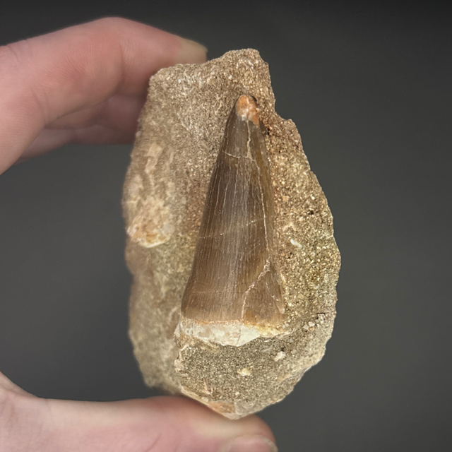 Mosasaur tooth found in Khouribga, Morocco. Around 70 million years old (Cretaceous). The tooth measures 4.2cm in length, 2.5cm in width and 1.7cm in height. Has had no repairs and no restoration.
