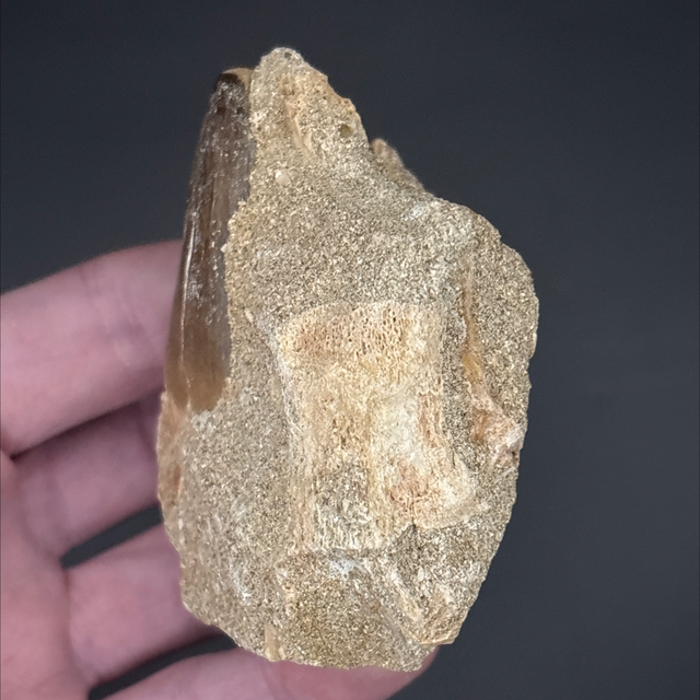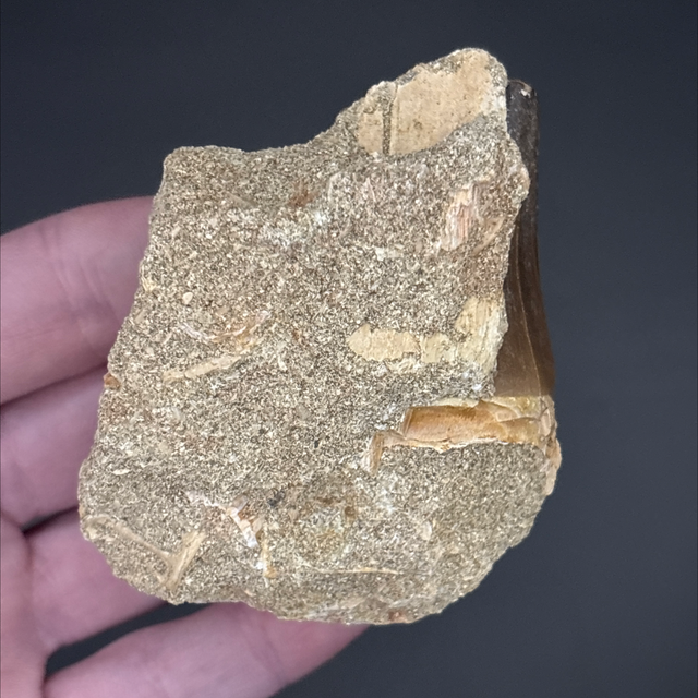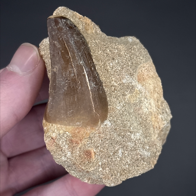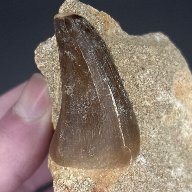 Mosasaur tooth found in Khouribga, Morocco. Around 70 million years old (Cretaceous). The tooth measures 4.2cm in length, 2.3cm in width and 2.4cm in height. Has had no repairs and no restoration.