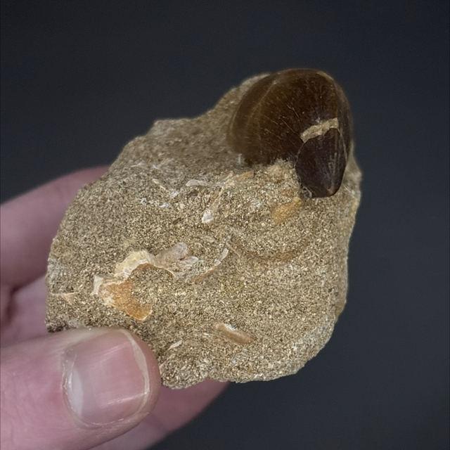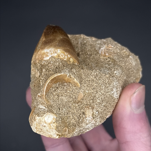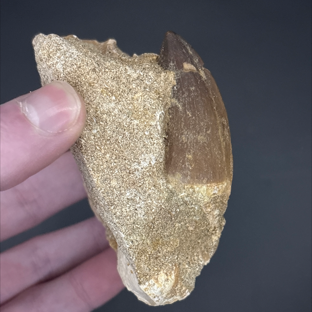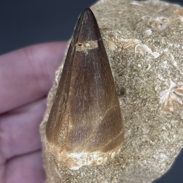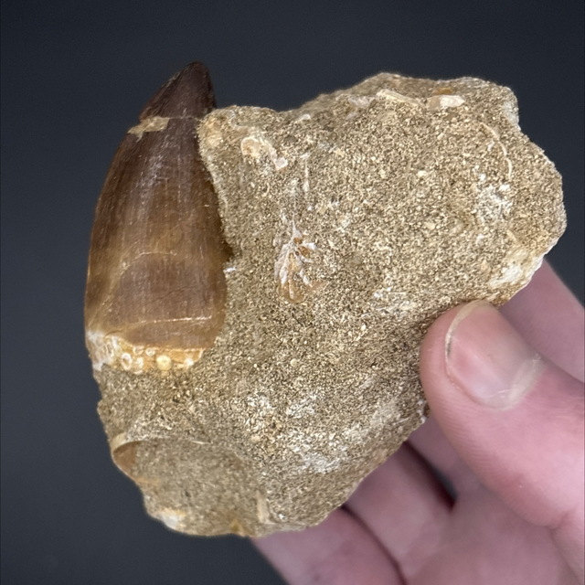 Mosasaur tooth found in Khouribga, Morocco. Around 70 million years old (Cretaceous). The tooth measures 4.4cm in length, 2cm in width and 2.3cm in height. Has had one repair and no restoration.