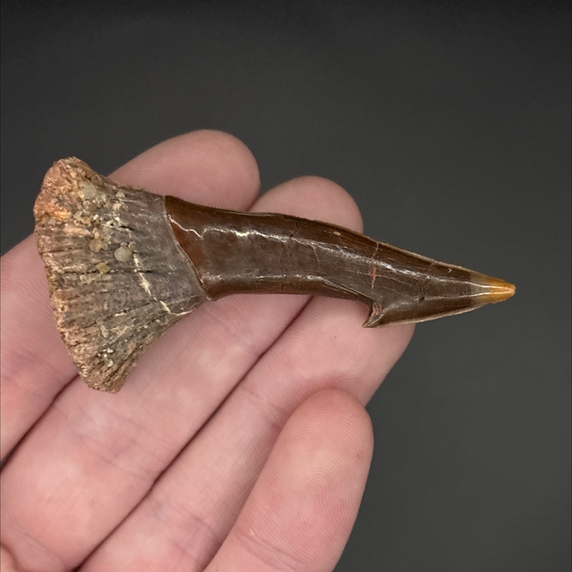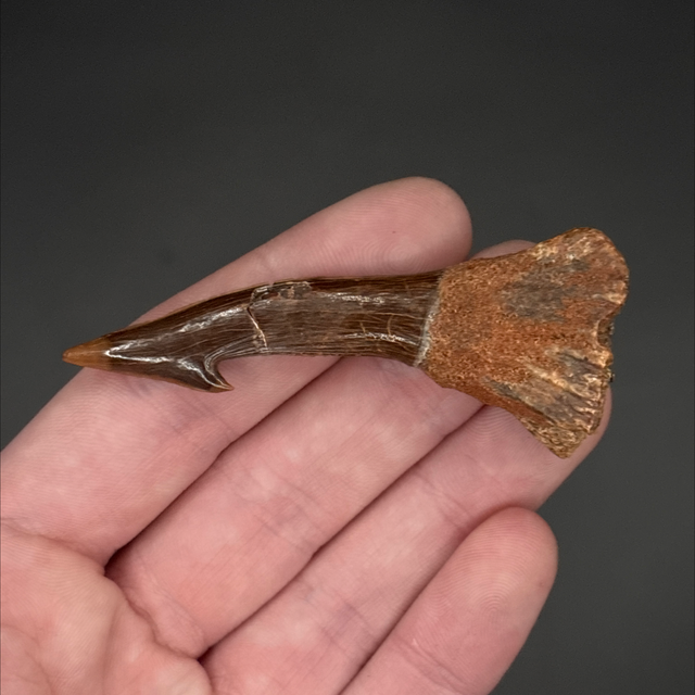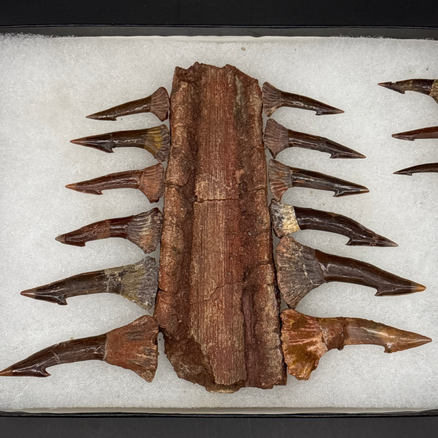 Onchopristis rostrum segment found in the Kem Kem basin in Morocco .This fossil is between 100-95 million years old (Cretaceous). The rostrum measures 13.5cm in length, 5cm in width and 1.5cm in height. Has had some repairs and no restoration. Please note the barbs are not associated with the rostrum.
