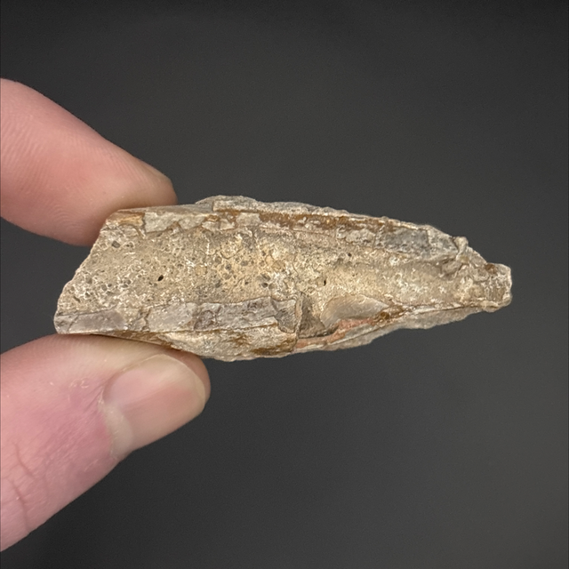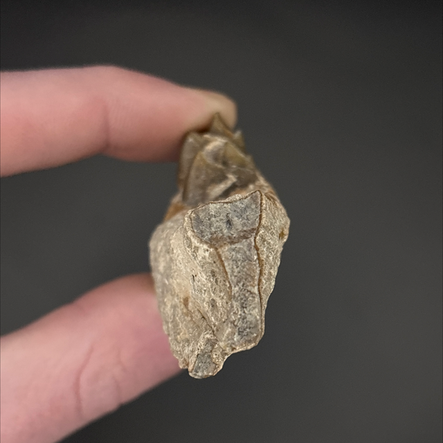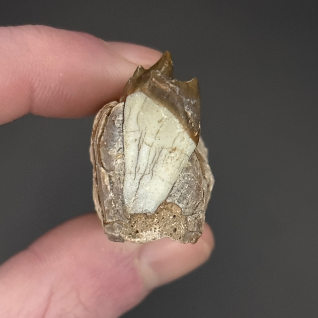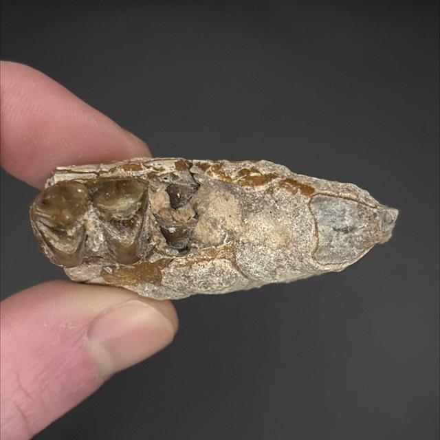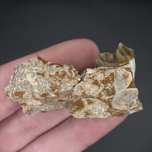 A section of jaw from an ancient hog like mammal called an Oreodont. Found in South Dakota, USA and is around 25 million years old (Oligocene). The fossil measures 5.1cm in length, 1.1cm in width and 1.5cm in height. Has had no repairs or restoration.
