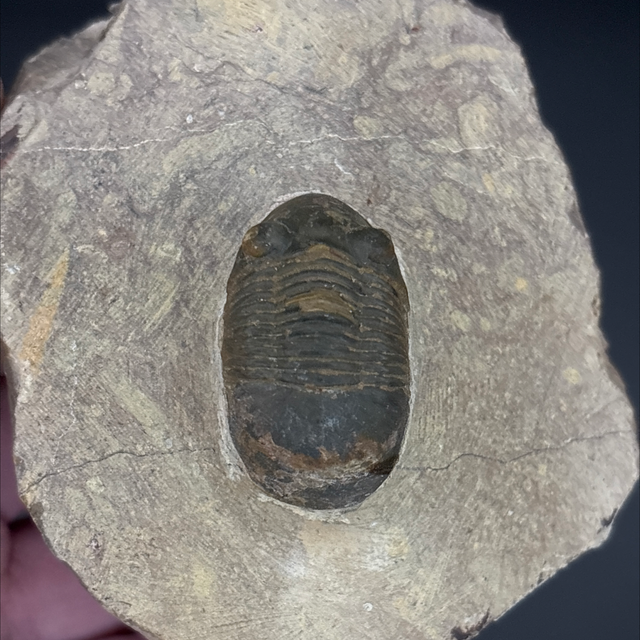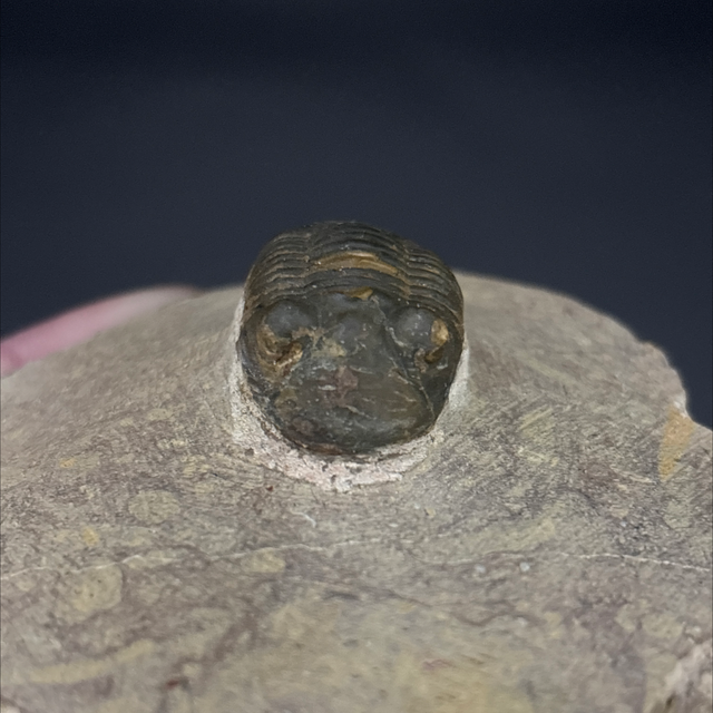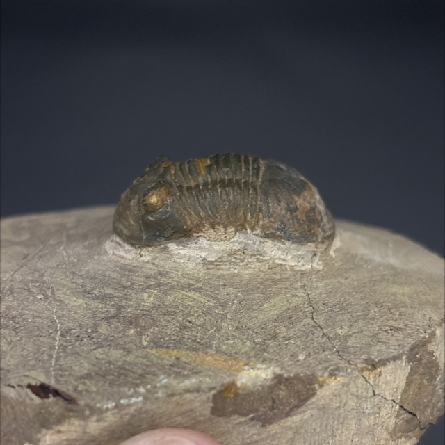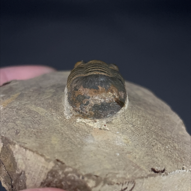 Paralejurus trilobite fossil found in Laghdad, Morocco. This fossil is between 419-359 million years old (Devonian). The trilobite measures 3.1cm in length 1.7cm in length and 1.4cm in height. Has had some repairs and no restoration.