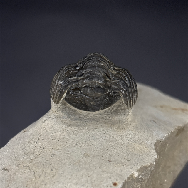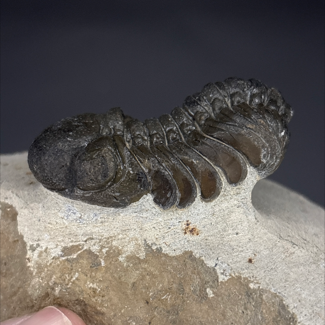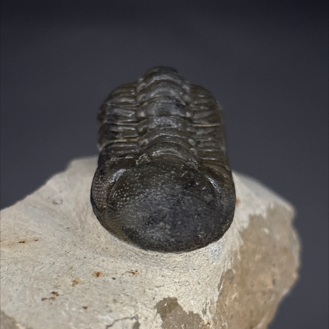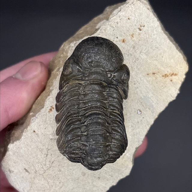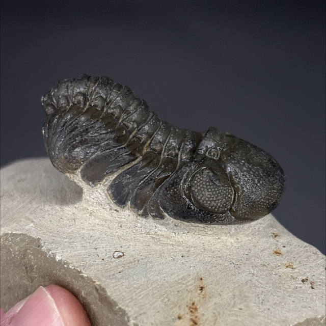 Phacops trilobite found in the Anti-Atlas Mountains in Morocco. Around 380 million years old (Devonian). The trilobite measures 5cm in length, 2.7cm in width and 2.2cm in height. Has had a couple repairs and small amount of restoration.
