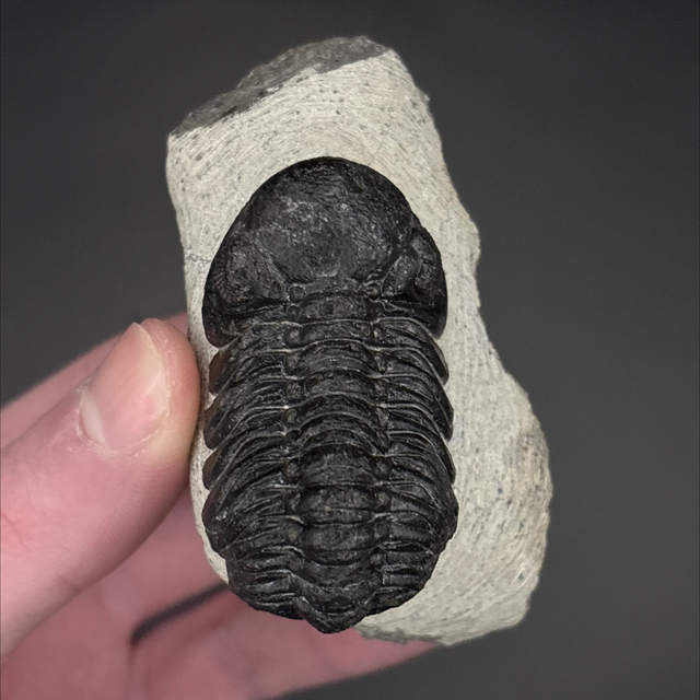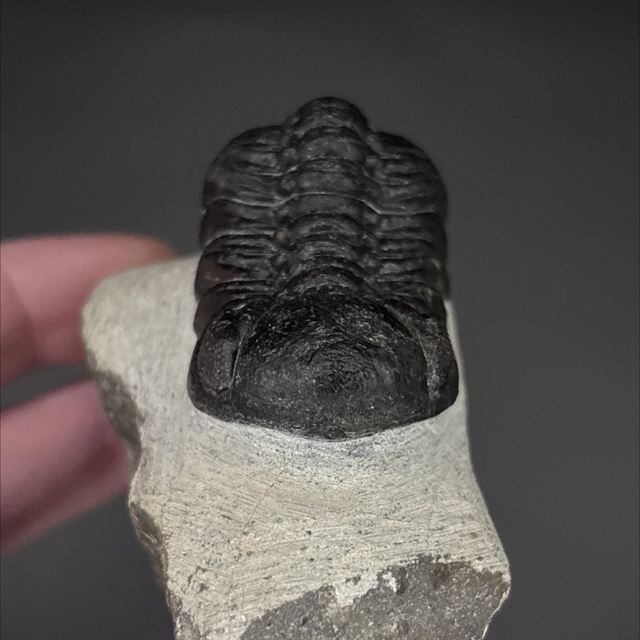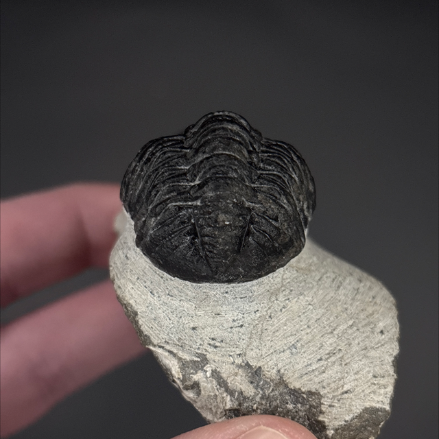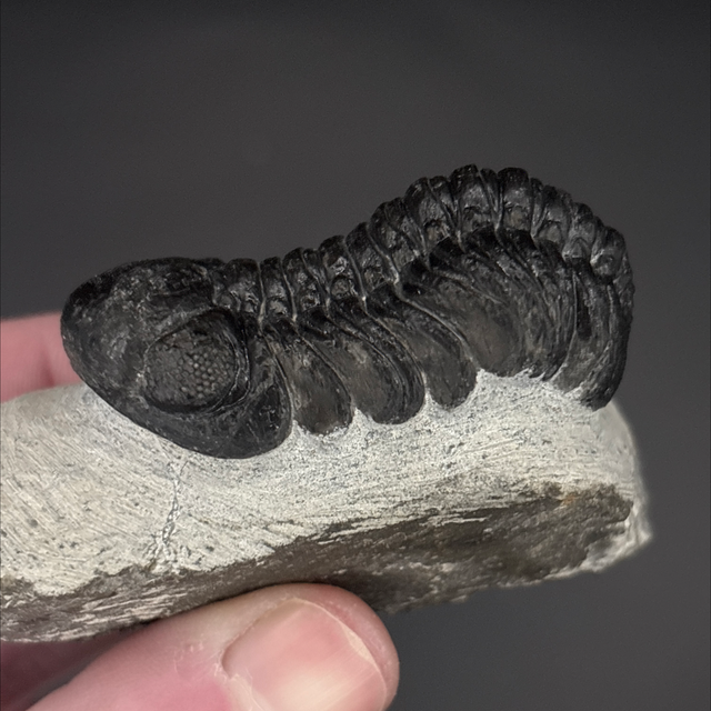 Phacops trilobite found in the Anti-Atlas Mountains in Morocco. Around 380 million years old (Devonian). The trilobite measures 5cm in length, 2.7cm in width and 3cm in height has had a couple repairs and a small amount of restoration.