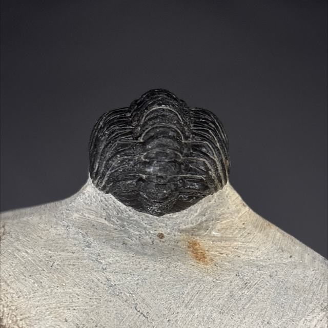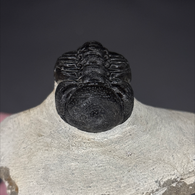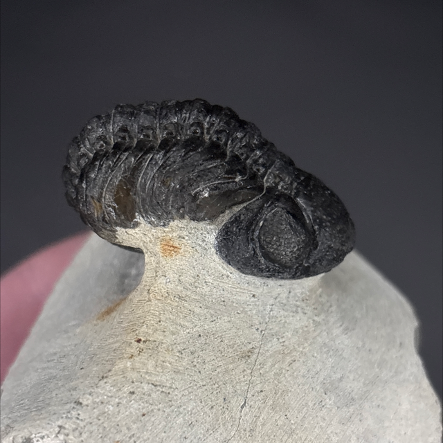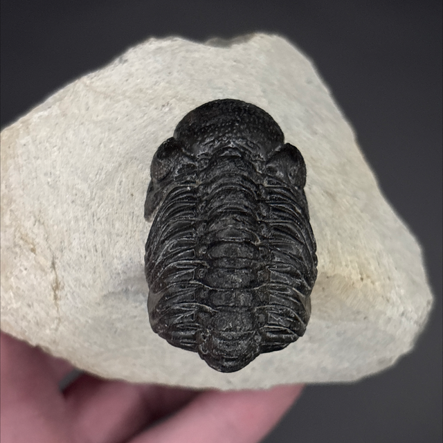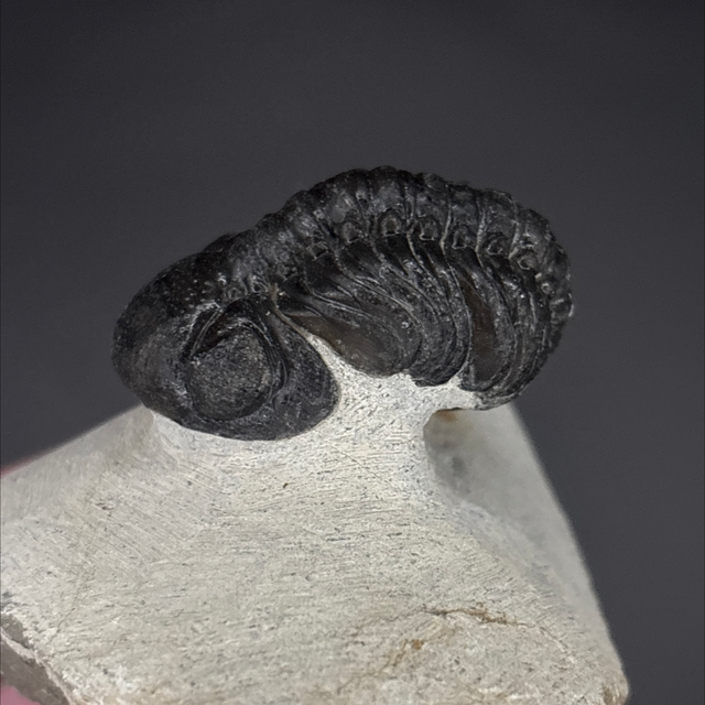 Phacops trilobite found in the Anti-Atlas Mountains in Morocco. Around 380 million years old (Devonian). The trilobite measures 4cm in length, 2.4cm in width and 2cm in height has had one repair and a small amount of restoration.