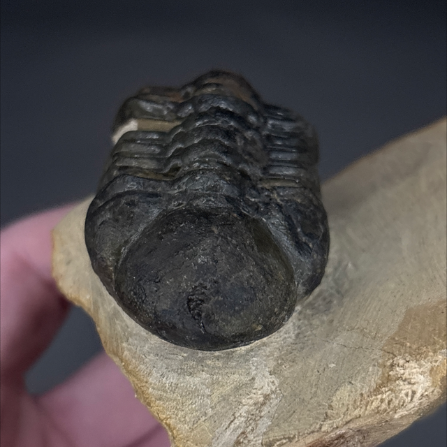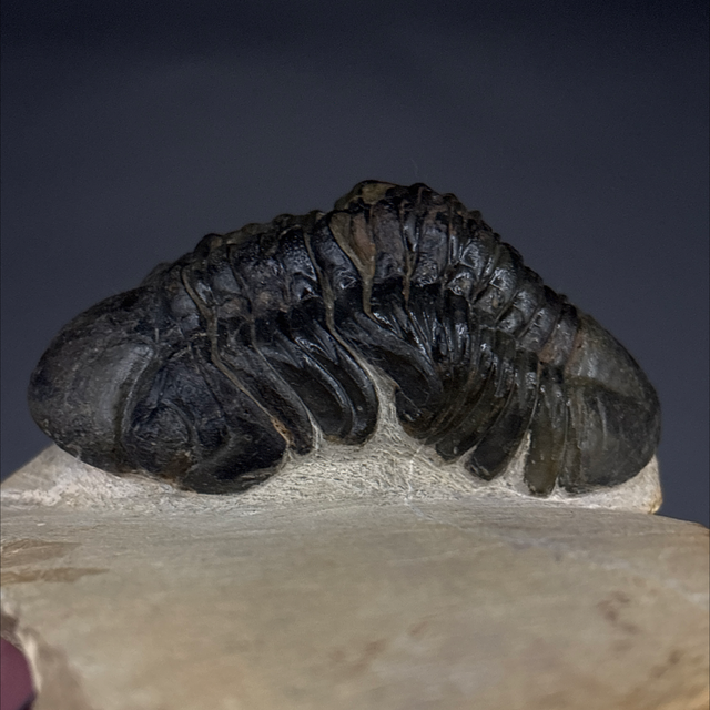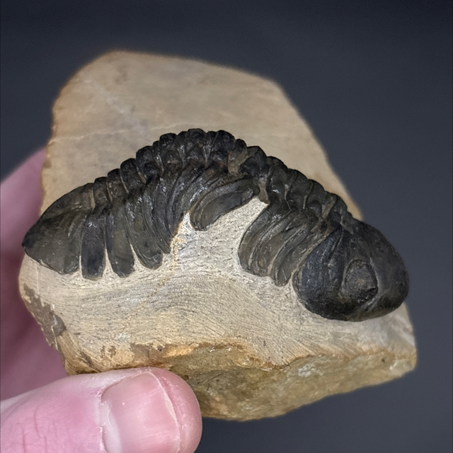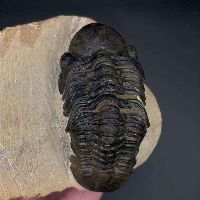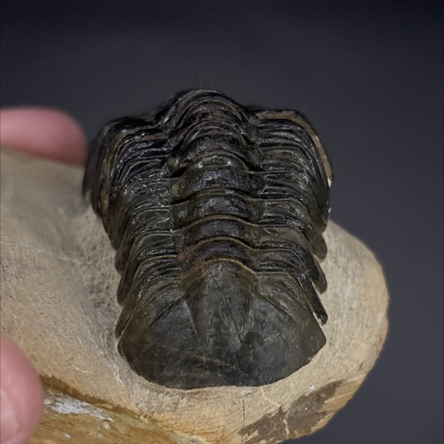 Phacops trilobite found in the Anti-Atlas Mountains in Morocco. Around 380 million years old (Devonian). The trilobite measures 7.1cm in length, 3.5cm in width and 2.8cm in height has had a couple repairs and a small amount of restoration.