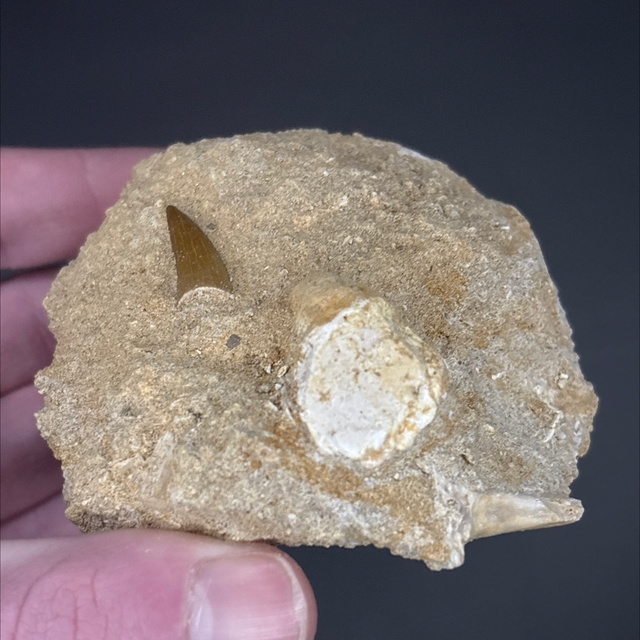 A tooth from a long neck marine reptile called a plesiosaur. This fossil was found in Morocco and is around 100 million years old (Cretaceous). The tooth measures 2.2cm in length and 7mm in width. Has had no repairs or restoration. The matrix also contains a fossilised fish bone.