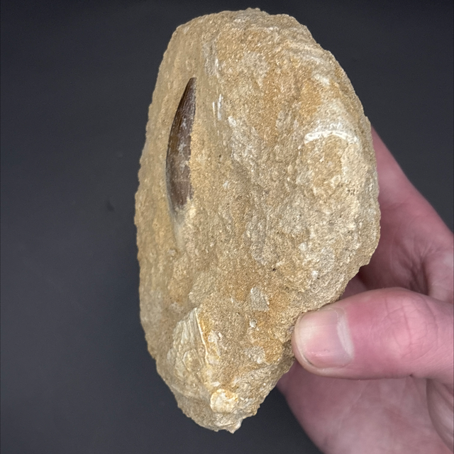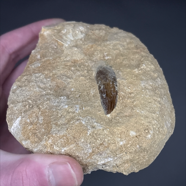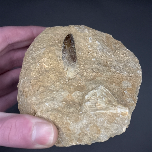 A tooth from a long neck marine reptile called a plesiosaur. This fossil was found in Morocco and is around 100 million years old (Cretaceous). The tooth measures 4.5cm in length and 1cm in width. Has had no repairs or restoration. The matrix also contains a fossilised fish bone.