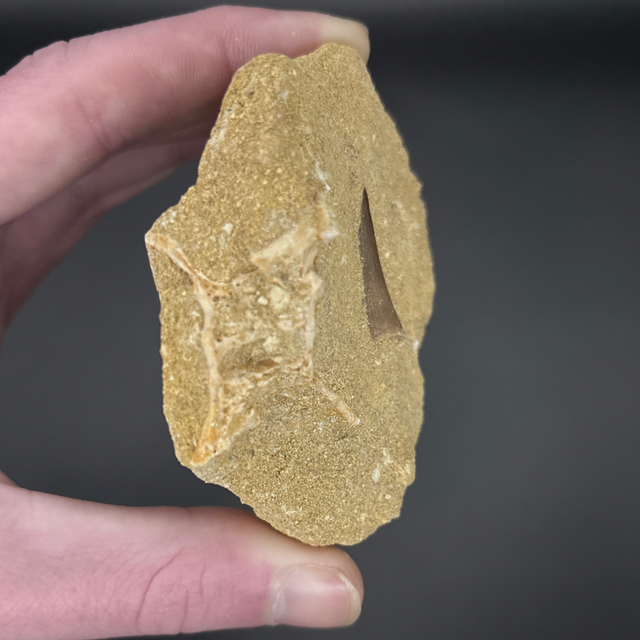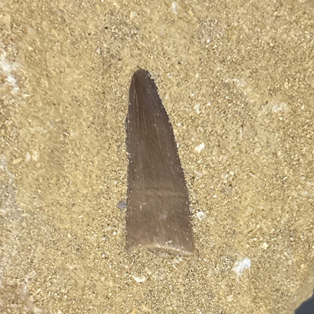 A tooth from a long neck marine reptile called a plesiosaur. This fossil was found in Morocco and is around 100 million years old (Cretaceous). The tooth measures 2.4cm in length and 7mm in width. Has had no repairs or restoration.
