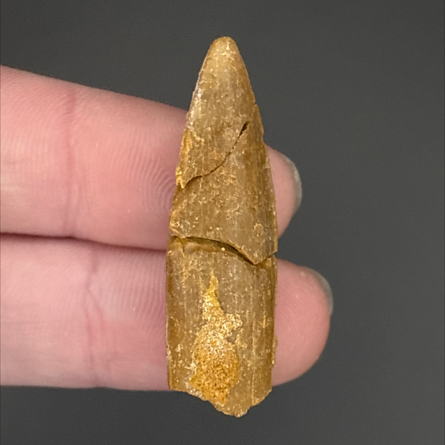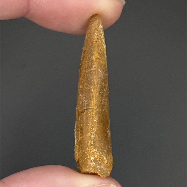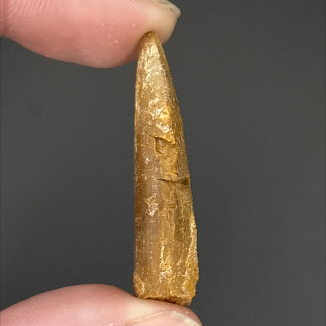 A dinosaur tooth from a long neck dinosaur (Sauropod) Rebbachisaurus. This fossil was found in Morocco and is around 100 million years old (Cretaceous). The tooth measures 3.6cm in length 1.1cm in width and 7mm in height. Has had two repairs and no restoration.