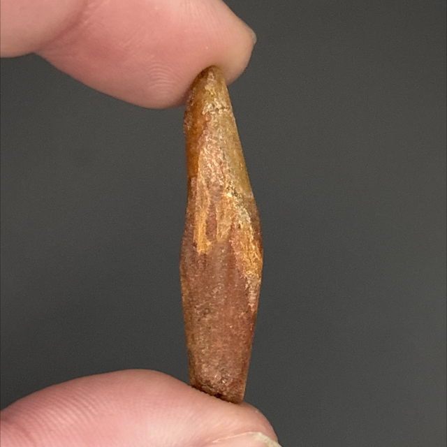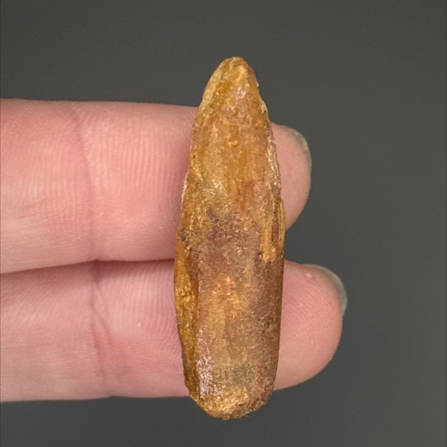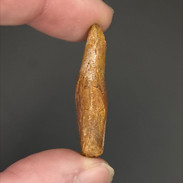A dinosaur tooth from a long neck dinosaur (Sauropod) Rebbachisaurus. This fossil was found in Morocco and is around 100 million years old (Cretaceous). The tooth measures 3.5cm in length 1cm in width and 6mm in height.