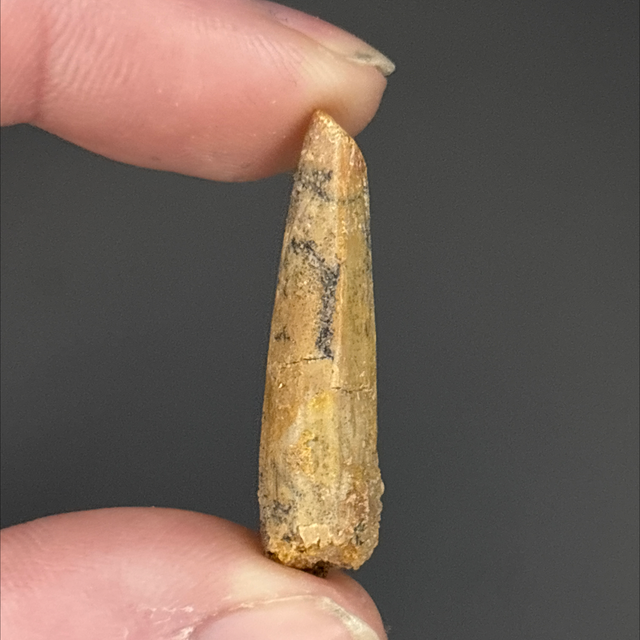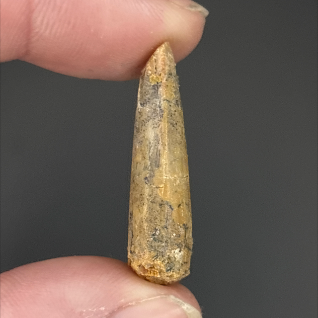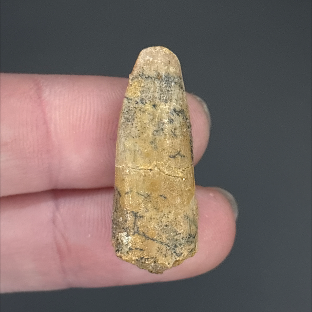A dinosaur tooth from a long neck dinosaur (Sauropod) Rebbachisaurus. This fossil was found in Morocco and is around 100 million years old (Cretaceous). The tooth measures 3cm in length 1.2cm in width and 6mm in height. Has had one repair and no restoration.