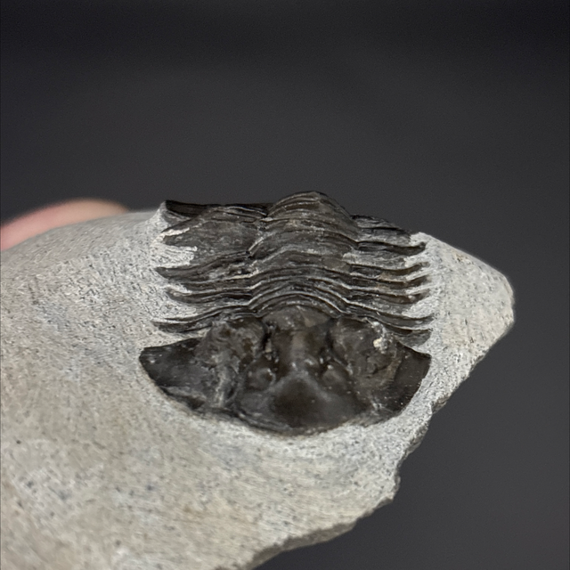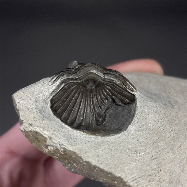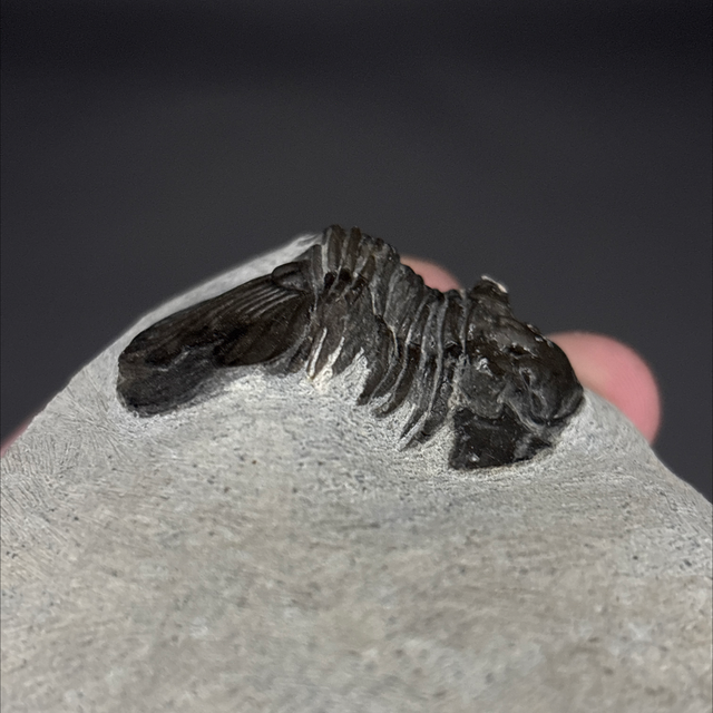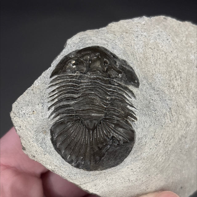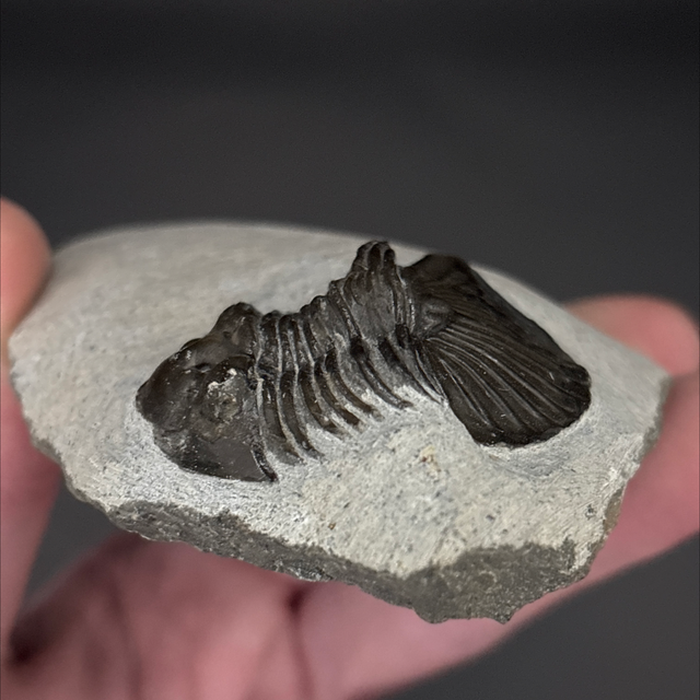 Scutellum trilobite found in the Anti-Atlas Mountains in Morocco. Around 380 million years old (Devonian). The trilobite measures 3.9cm in length, 2.8cm in width and 2.7cm in height has had no repairs and a small amount of restoration.