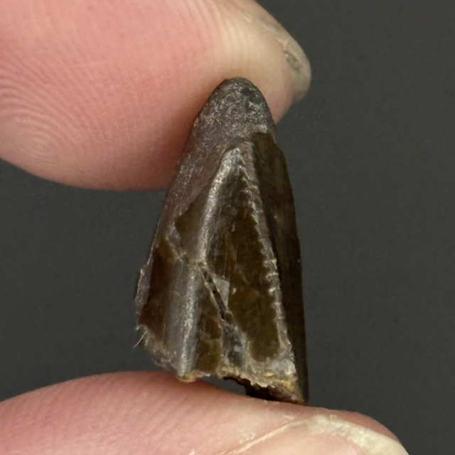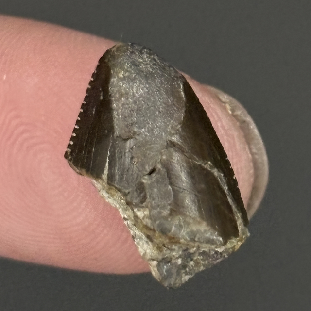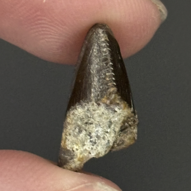 A rare Torvosaurus tooth tip from the Morison formation in Colorado, USA. 150 million years old (Jurassic). The fossil measures 1.6cm in length 1cm in width and 7mm in height. Has had no repairs or restoration.