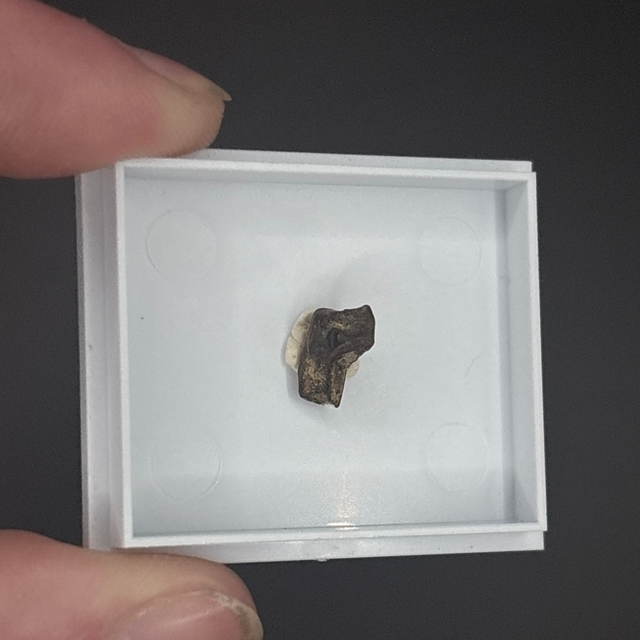 Triceratops tooth shard found in the Hell Creek formation in South Dakota, USA .This fossil is around between 67-66 million years old (Cretaceous). The fossil measures 8mm in length, 5mm in width and 4mm in height. Has had no repairs and no restoration.