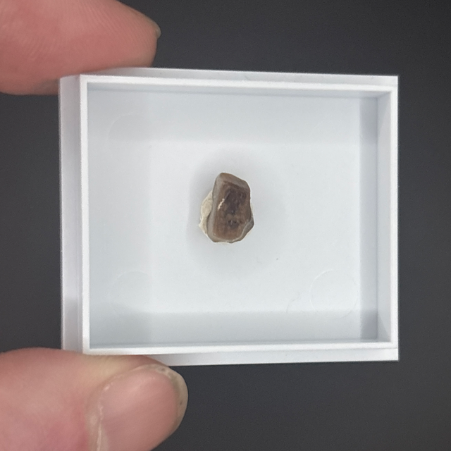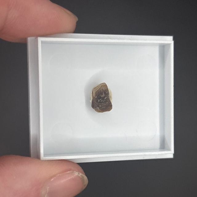 Triceratops tooth shard found in the Hell Creek formation in South Dakota, USA .This fossil is around between 67-66 million years old (Cretaceous). The fossil measures 7mm in length, 6mm in width and 3mm in height. Has had no repairs and no restoration.