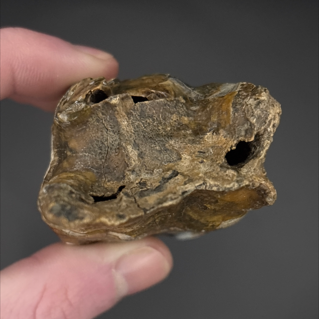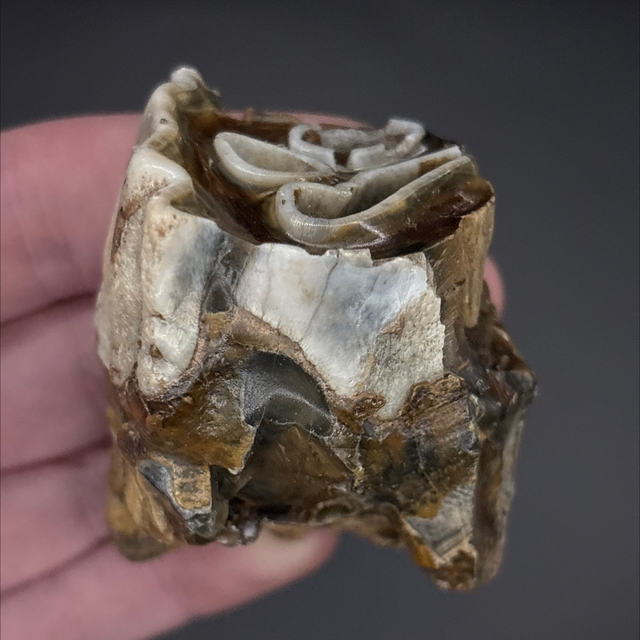 A tooth fragment from a Woolly Rhino. Found in Siberia this fossil is around 20,000 years old (Pleistocene). The tooth measures 4.4cm in length 3.5cm in width and 5.7cm in height. Has had no repairs or restoration.